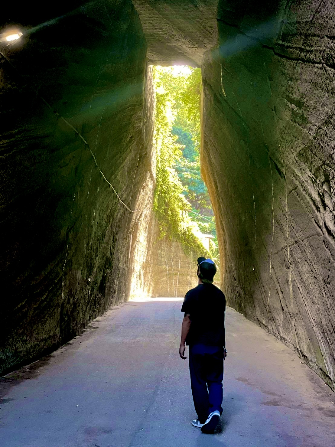 トンネルに近づくと、まずそのスケールに圧倒されました。高さ約10m、幅も広々とした切通しは、明治〜大正時代に手掘りで作られたものだそう。鋸山の石切り技法を使って昭和初期に整えられたとか、歴史の重みがビシビシ伝わってきます。入り口は薄暗く、岩肌のざらざらした手掘り跡がリアル。凝灰質砂岩の柔らかい地層が、房総の山の秘密を物語ってるみたいで、思わず指で撫でてしまいました。まるでファンタジー映画のセット! 「この先、何が出てくるんだろう?」って、子供みたいにドキドキ。