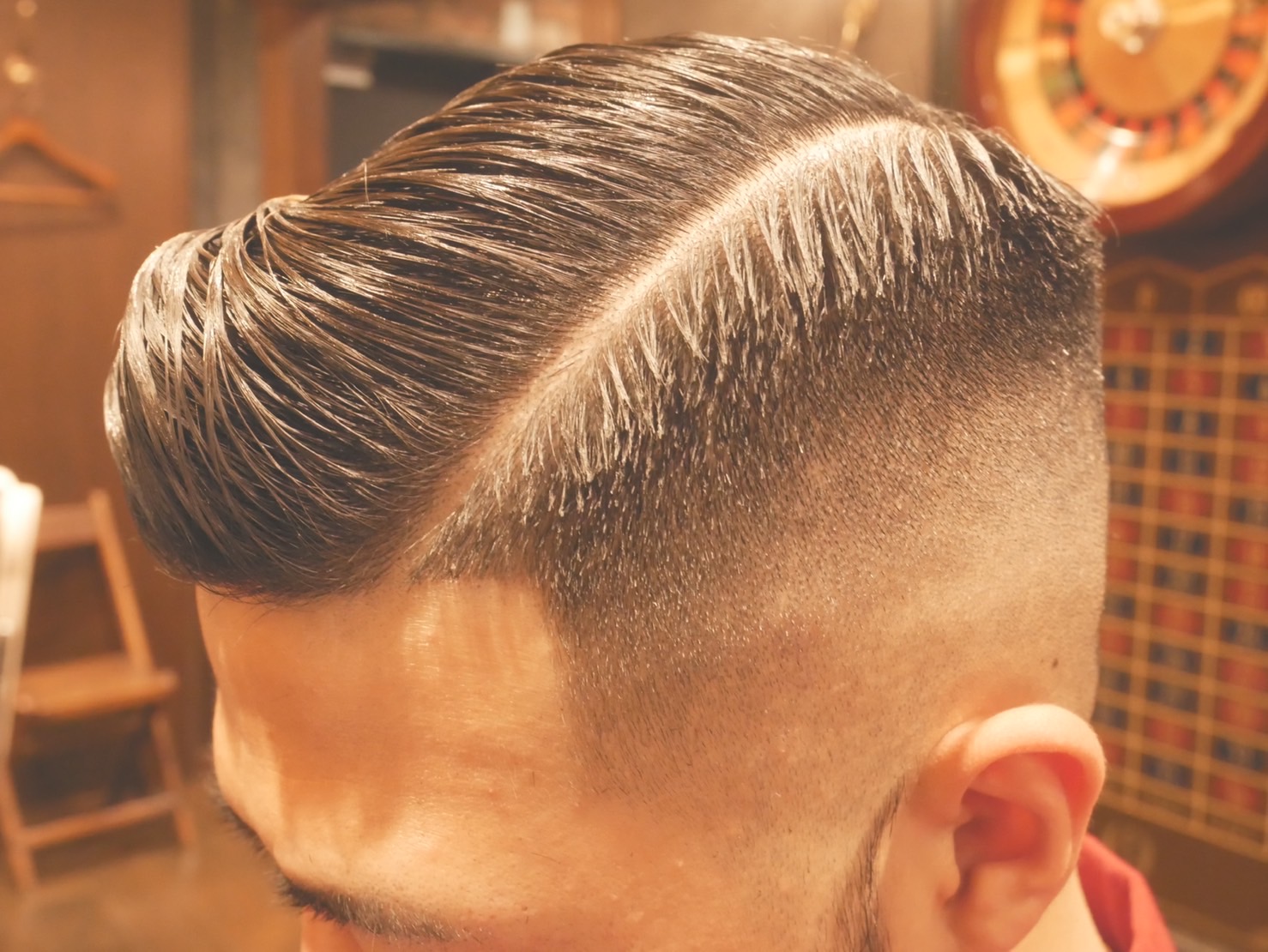このスタイルで重要なのは、単に刈り上げるだけではなく、フェードのグラデーション精度と分け目の設計です。肌が透けるゾーンからトップへのつながりが雑だと、伸びてきた際にムラが出やすくなります。また73分けは骨格や生えグセを無視すると、割れすぎたり、立ち上がりが弱くなったりします。だからこそミリ単位での刈り幅調整と、乾かし方まで含めたデザイン設計が不可欠です。