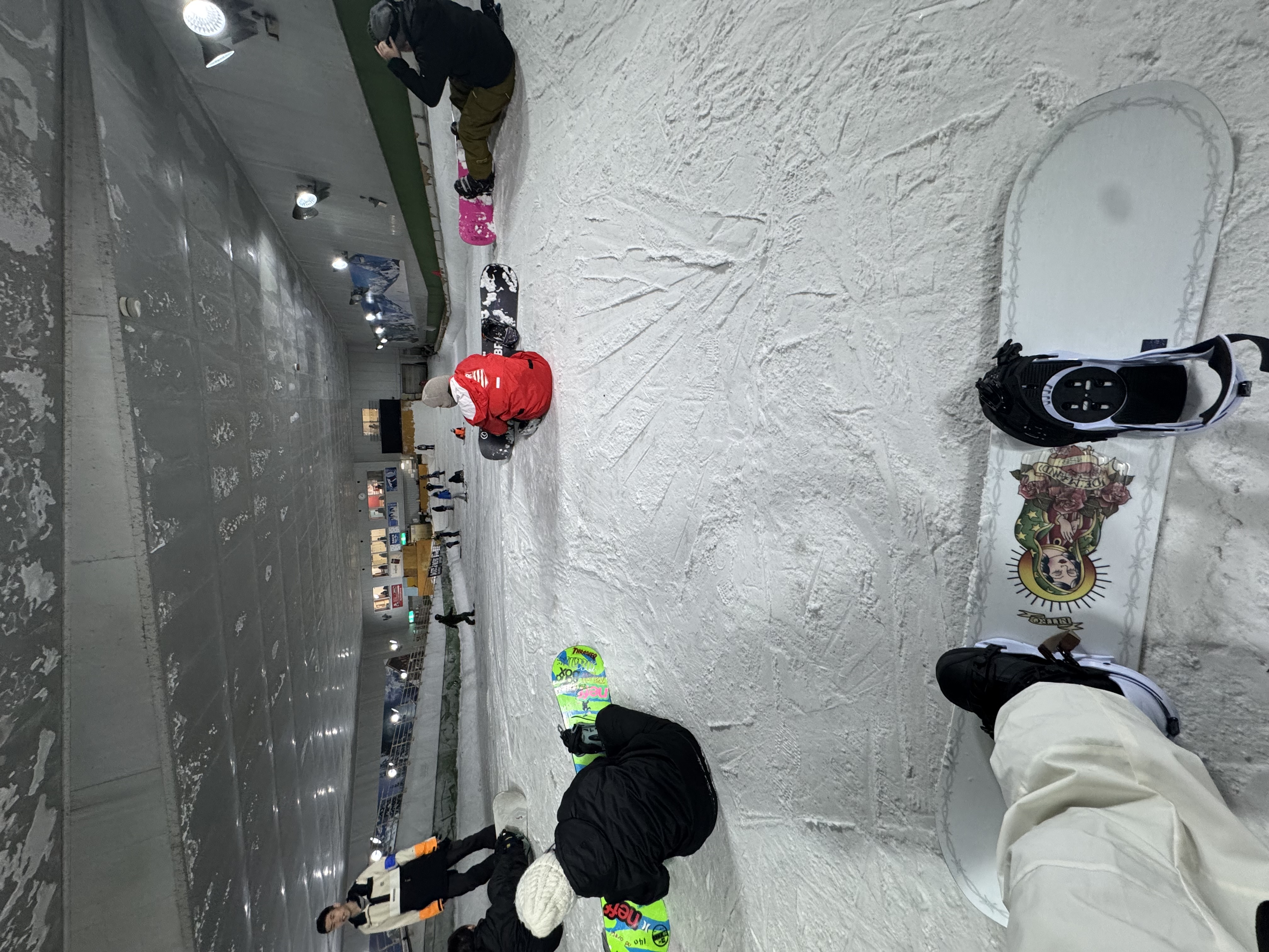 今回は、苦手なヒールサイドのターンと、安定した直滑降を重点的に練習。室内は斜面が安定しているので、自分のフォームの癖をじっくり確認できるのが最高ですね。転んでも雪が柔らかいので、ついつい攻めた動きに挑戦してしまいました。